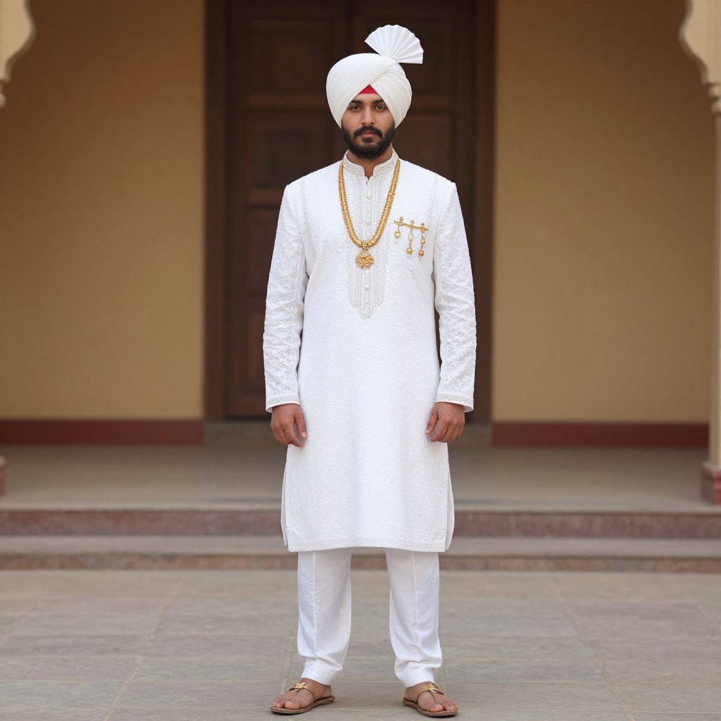 White jodhpuri suit wedding, 1boy, male focus, solo, facial hair, mustache, beard, standing, full body, white pants, looking at viewer, jewelry, turban, necklace, old