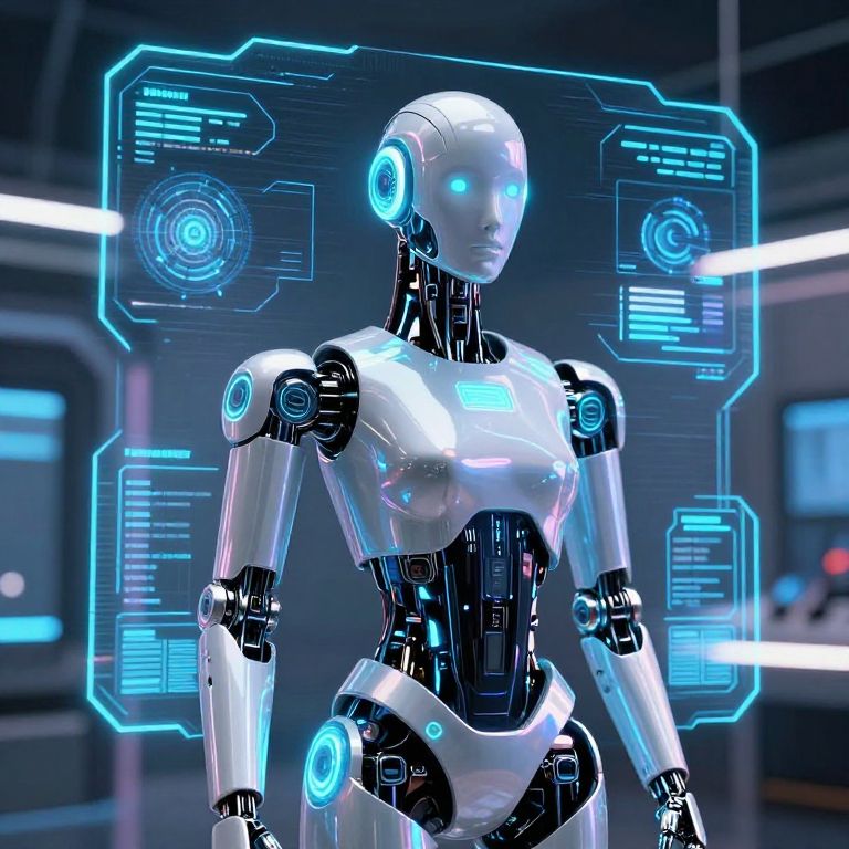 CGI image of a sleek, futuristic, white and black robotic woman with glowing blue accents, standing in a high-tech lab with holographic blue interfaces