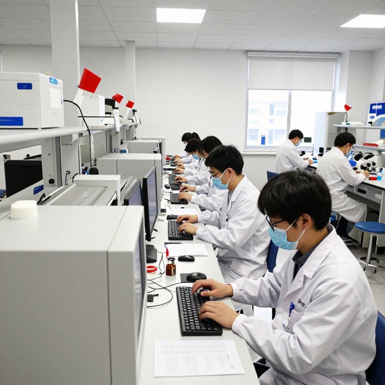 A well-lit university research lab filled with scientists in lab coats conducting experiments, high-tech equipment, and scientific instruments