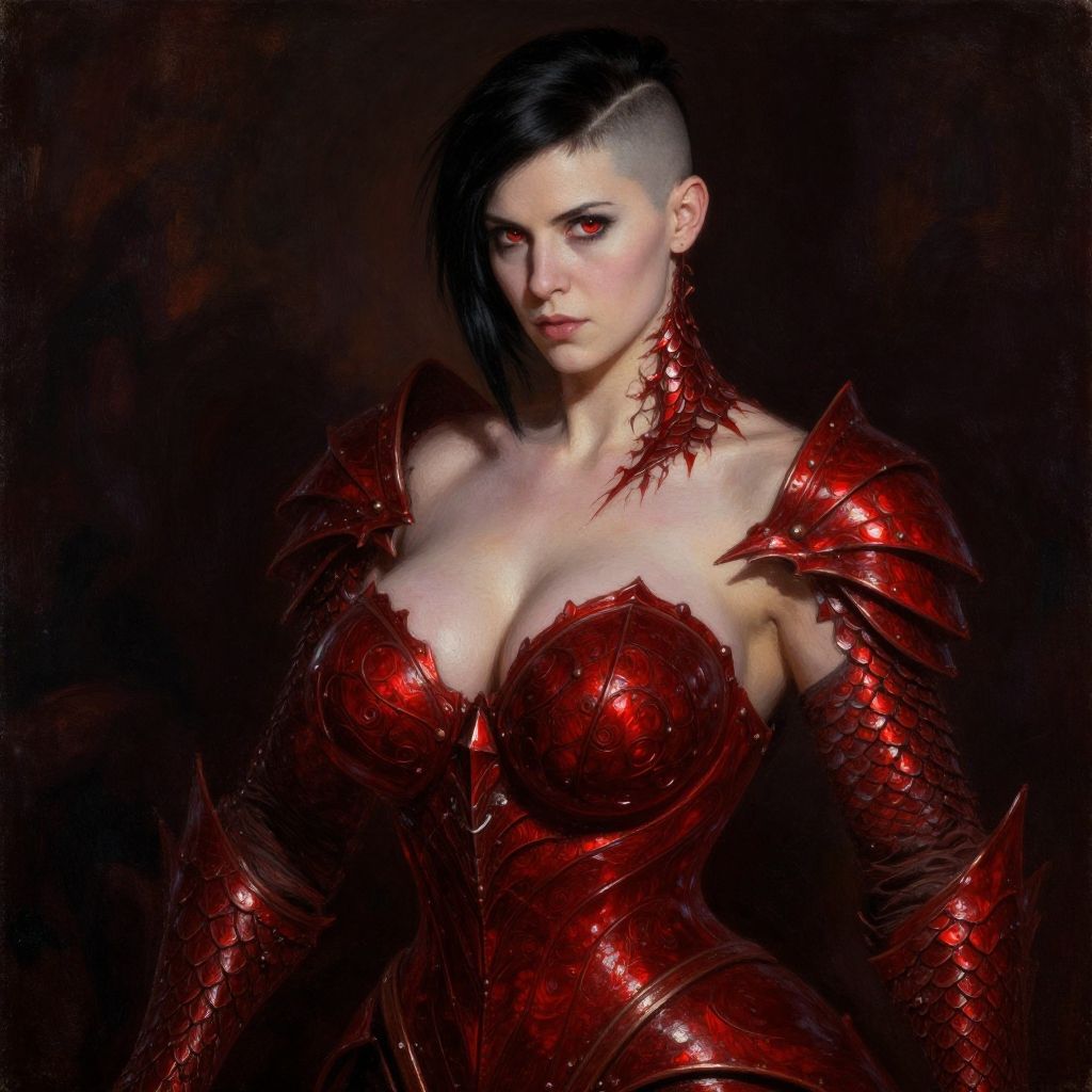 Digital artwork of a pale-skinned, dark-haired woman with a mohawk, wearing a red, armor-like corset with intricate scales, against a