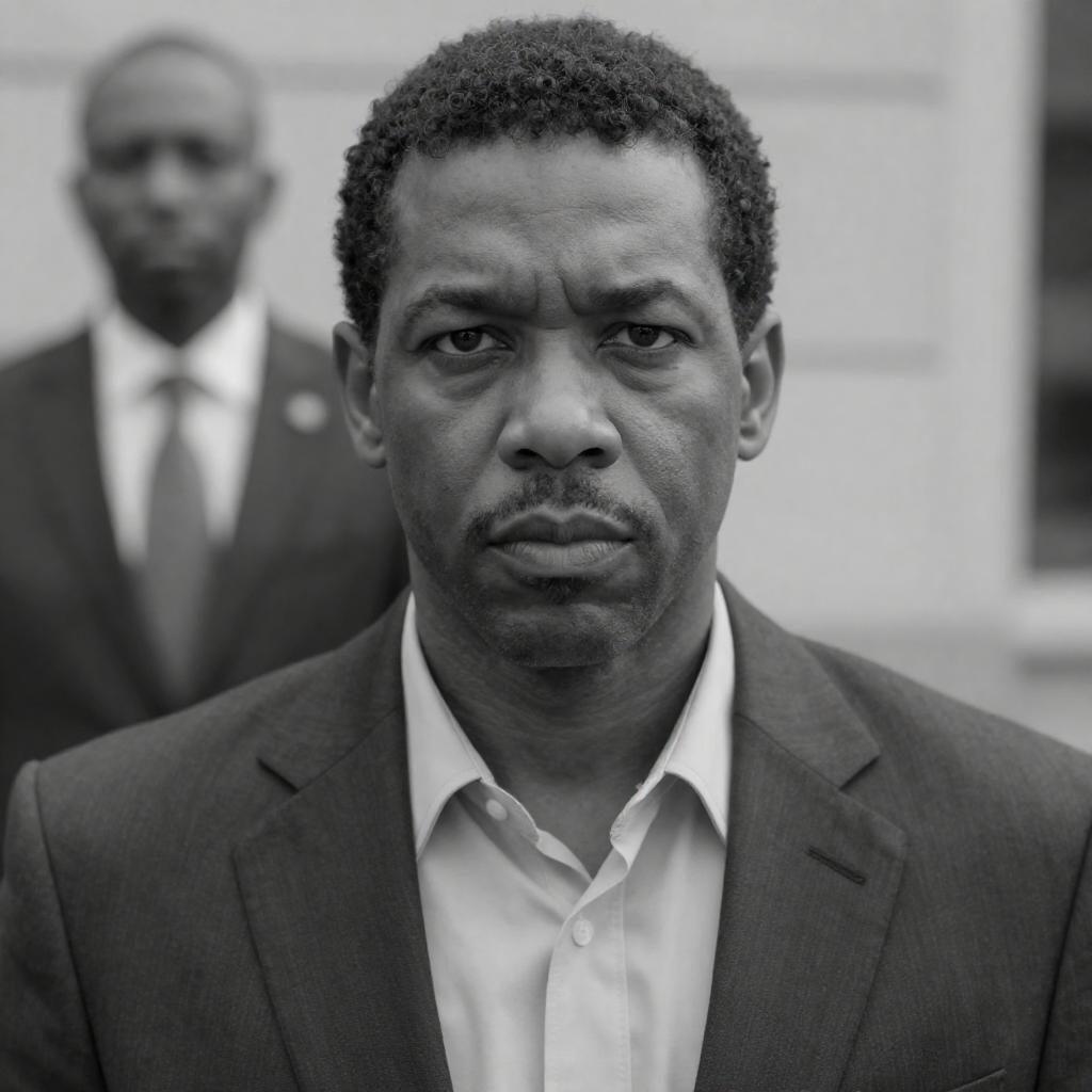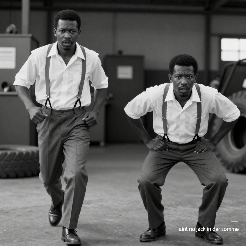 Black and white photograph of two African-American men in a warehouse. Both wear white shirts, suspenders, and slacks. Left man runs with arms bent, right man crouches with arms on hips. Background includes industrial equipment and a large tire. Intense expressions. "ain't no jack in dar somme" in bottom right.