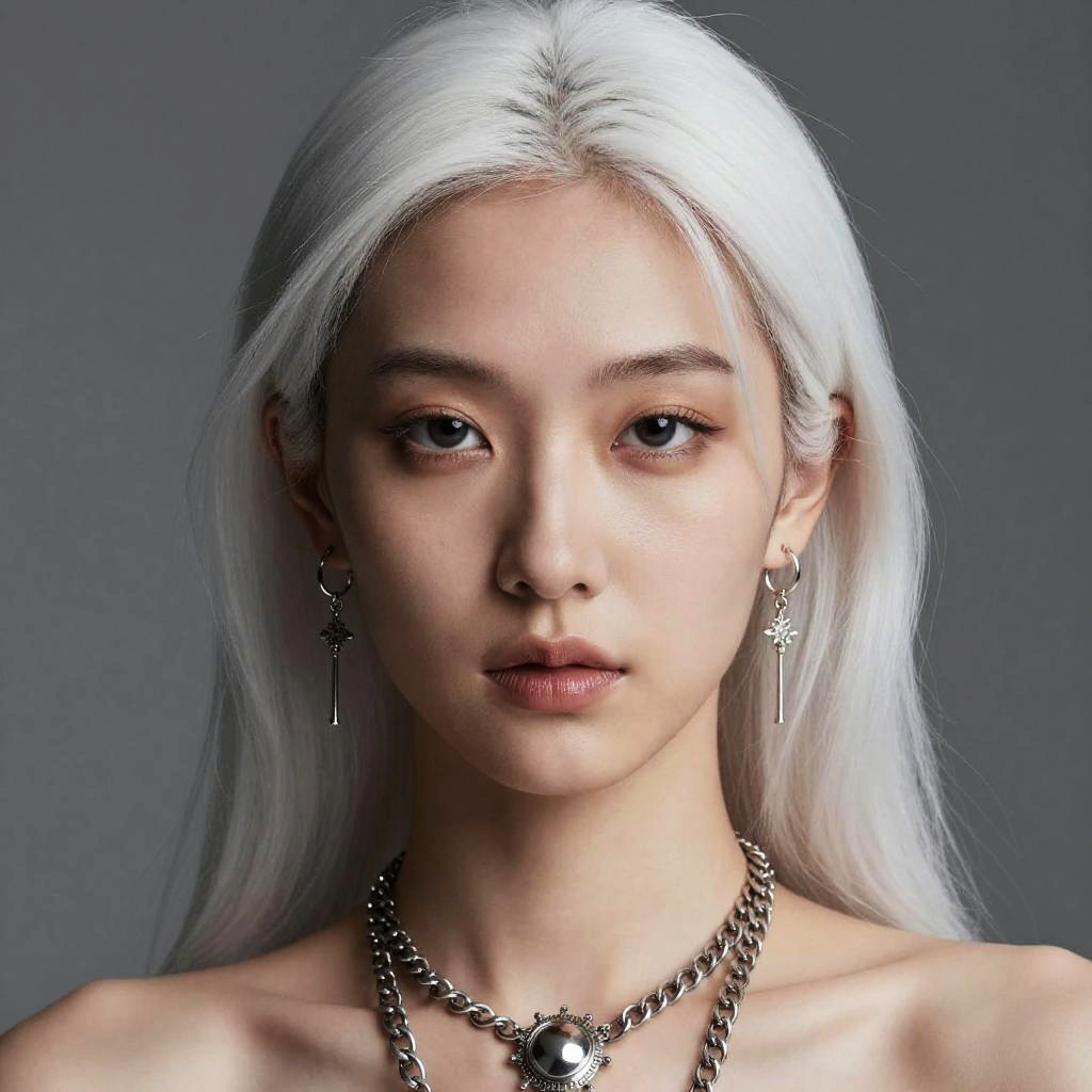 Close-up portrait of white hair Asian model with porcelain skin, intricate silver jewelry, minimalist studio background, high contrast lighting, elegant and mysterious vibe