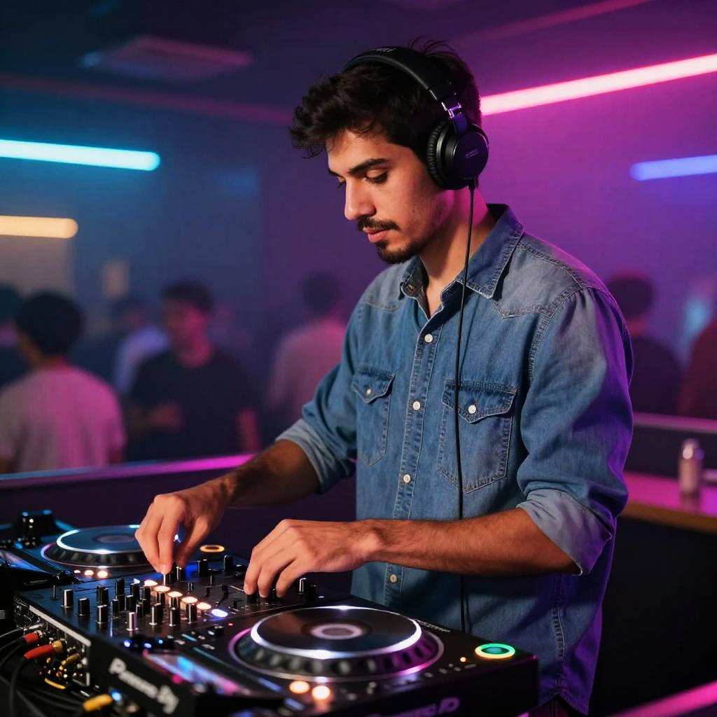 Photograph of a young man with curly hair, wearing a denim shirt and headphones, mixing music on DJ equipment in a dimly lit, colorful club
