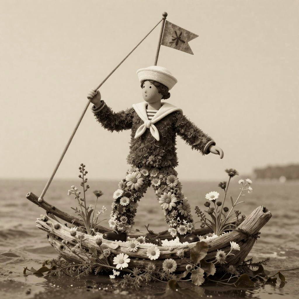 Sepia-toned vintage style photograph of a maritime sailor figurine crafted from driftwood, seaweed, and an assortment of wildflowers. The sailor is adorned with salt-encrusted flowers and foliage, standing on a wooden boat decorated with additional flowers and vegetation, set against a calm sea background. Artistic floral composition in early 20th-century Pictorialist photographic style.
