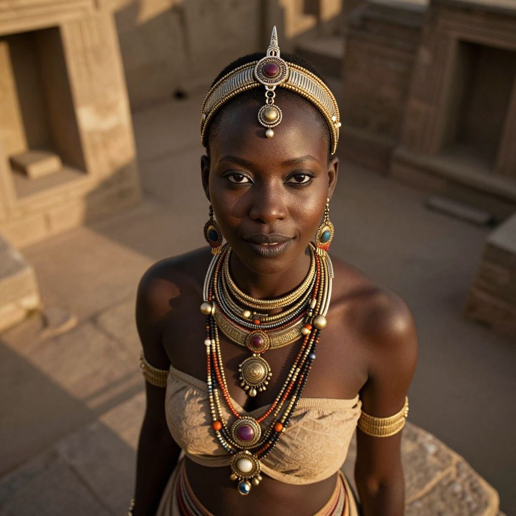 Imagine an ultrarealistic portrait of an enigmatic African woman adorned with intricate, handcrafted jewelry, standing amidst a backdrop of ancient ruins. The soft golden light bathes her, highlighting her fierce gaze and serene smile, a captivating blend of mystery and tranquility. Captured from an elevated angle, her regal posture commands attention, with shadows and light casting an enchanting aura that transports viewers to a realm where past and future converge in a harmonious dance.