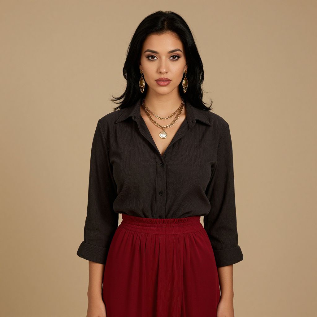 Photograph of a young woman with medium brown skin and black, wavy hair that falls to her shoulders. She has dark eyebrows, brown eyes, and wears red lipstick. She is dressed in a black, button-up shirt with the sleeves rolled up to her elbows, and a high-waisted, maroon skirt. She is adorned with two layered gold necklaces and dangling gold earrings. The background is a plain, beige color. She stands facing the camera with a neutral expression. The image has a clean, studio-like quality with soft lighting.