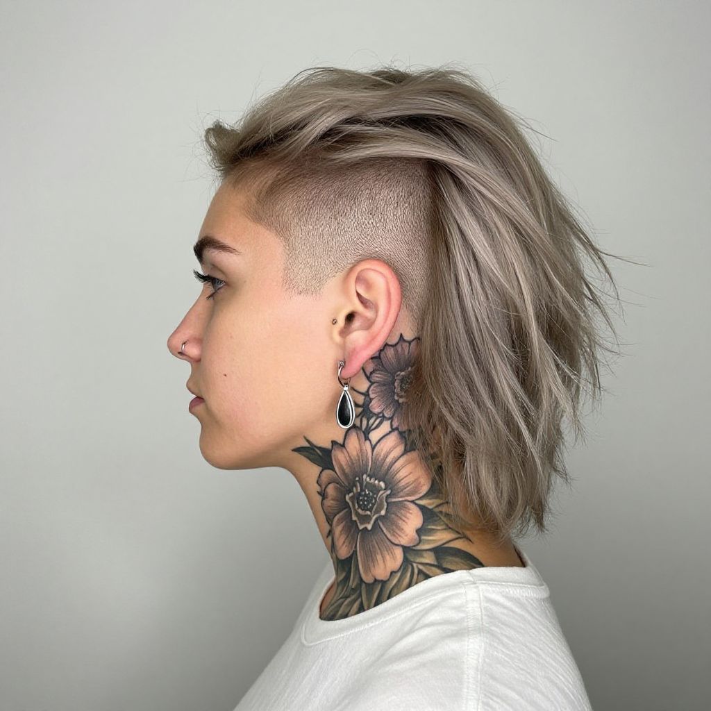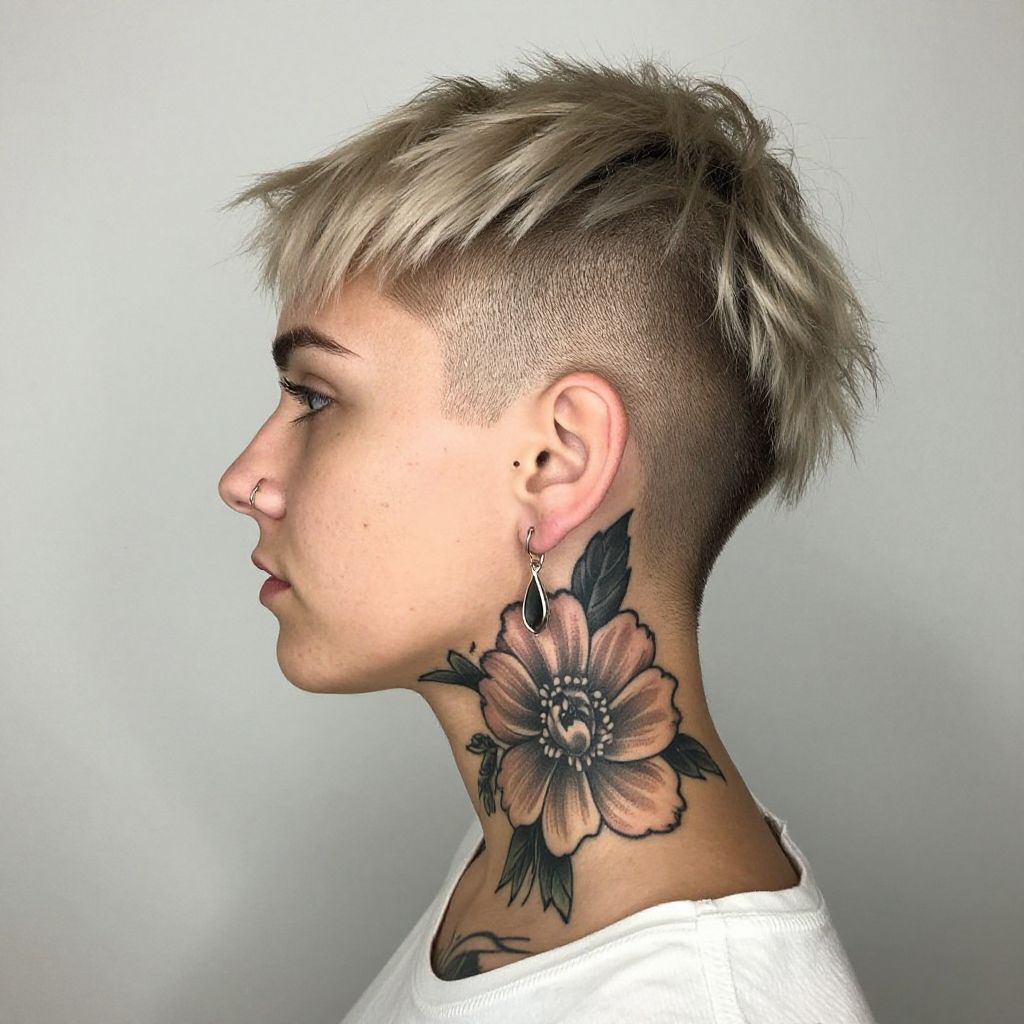 Photograph of a woman in profile with light blonde, slightly messy hair, and a shaved undercut. She has a nose ring, large flower tattoos covering her neck and jawline, and a teardrop earring in her left ear. Her skin is fair, and she's wearing a white shirt. The background is a plain, light gray wall. The tattoos are detailed and dark, contrasting with her light hair and skin.