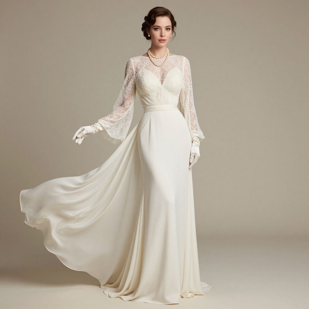 Photograph of a fair-skinned woman with dark, wavy hair styled in an elegant updo, wearing a white, floor-length wedding gown. The gown features long, lace sleeves and a deep V-neckline adorned with delicate lace detailing. She wears white, satin gloves that reach her wrists. The dress has a fitted bodice and a flowing, satin skirt that fans out slightly behind her. She stands against a plain, gray backdrop, exuding a timeless, classic bridal elegance. The lighting is soft, highlighting the texture of the lace and the smoothness of the satin.