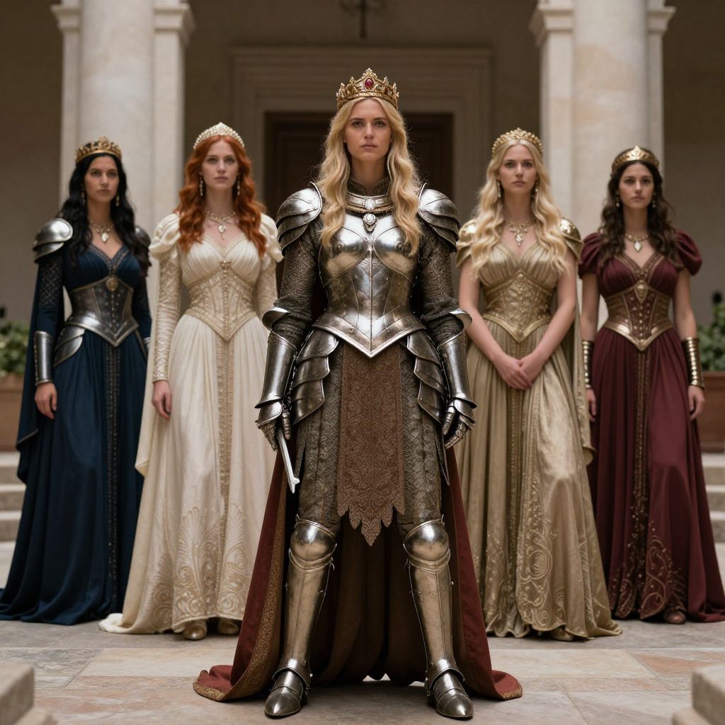 Attire gods and goddesses, a woman in armor and a crown standing in a courtyard