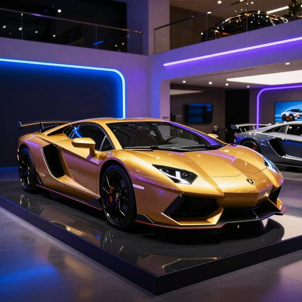 Neon Gold Lamborghini in Futuristic Showroom