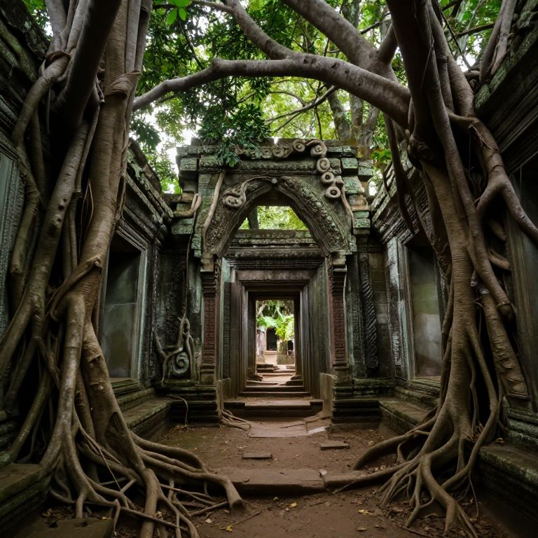 Roots entwine ancient stone arches, weaving a path of serenity and mystery beneath the canopy of life, where whispers of forgotten worlds linger in the dappled light and earthy scents of decay and renewal.