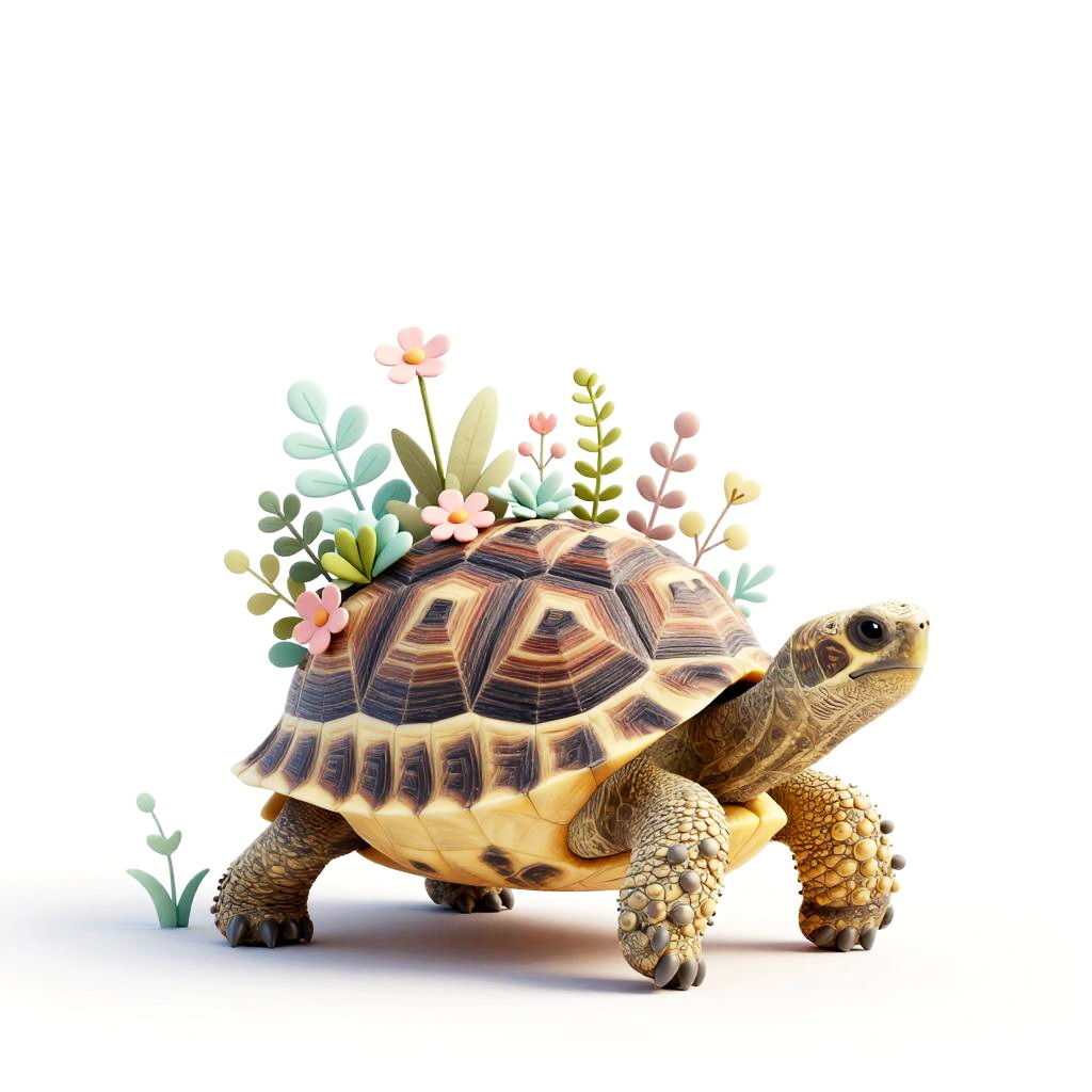 A gentle tortoise with a patterned shell, carrying a miniature garden on its back, digital art in a semi-realistic style with vibrant textures and soft lighting, surrounded by delicate foliage and tiny flowers, warm pink, mint, and beige accents, diffused studio lighting on a clean white background, centered composition, delicate line art, smooth rounded forms, subtle paper grain texture, soft shadows, high clarity, whimsical and inviting mood, balanced negative space, crisp color transitions, tidy presentation