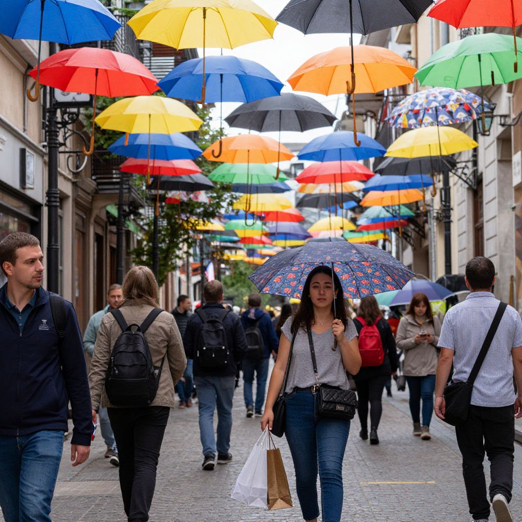Vibrant umbrellas zigzag above a bustling pedestrian street in Bucharest, creating a colorful canopy as people walk below, including a woman carrying shopping bags under her own umbrella.
