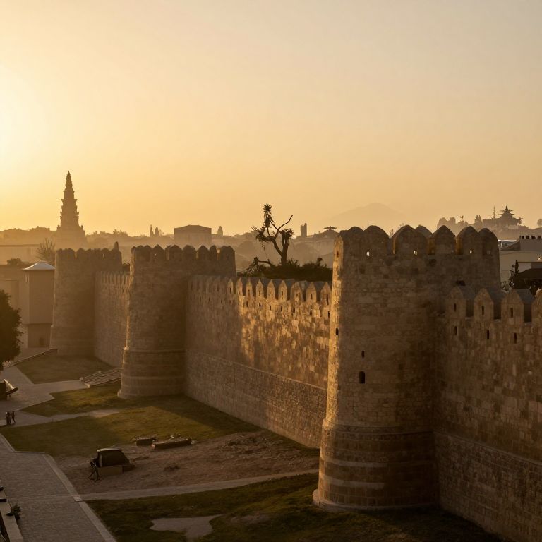 Through the golden haze of dawn, the ancient walls part like whispered secrets, revealing a city etched in light and shadow—a testament to the enduring dance between solitude and eternity.