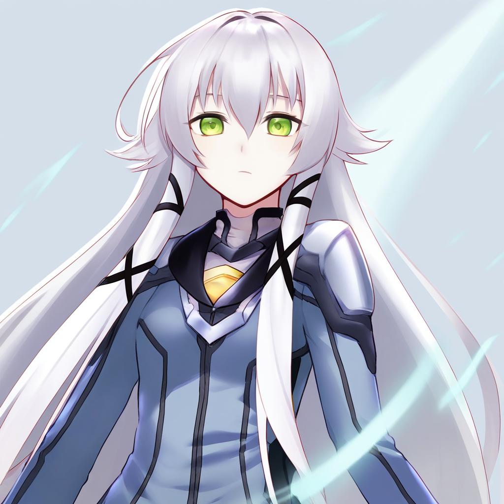 Digital anime illustration of a girl with very long white and grey hair, green eyes, and sidelocks. She is wearing a futuristic blue and black outfit with armor-like shoulder pads and a yellow emblem on her chest. The artwork style is inspired by artist k2isu.