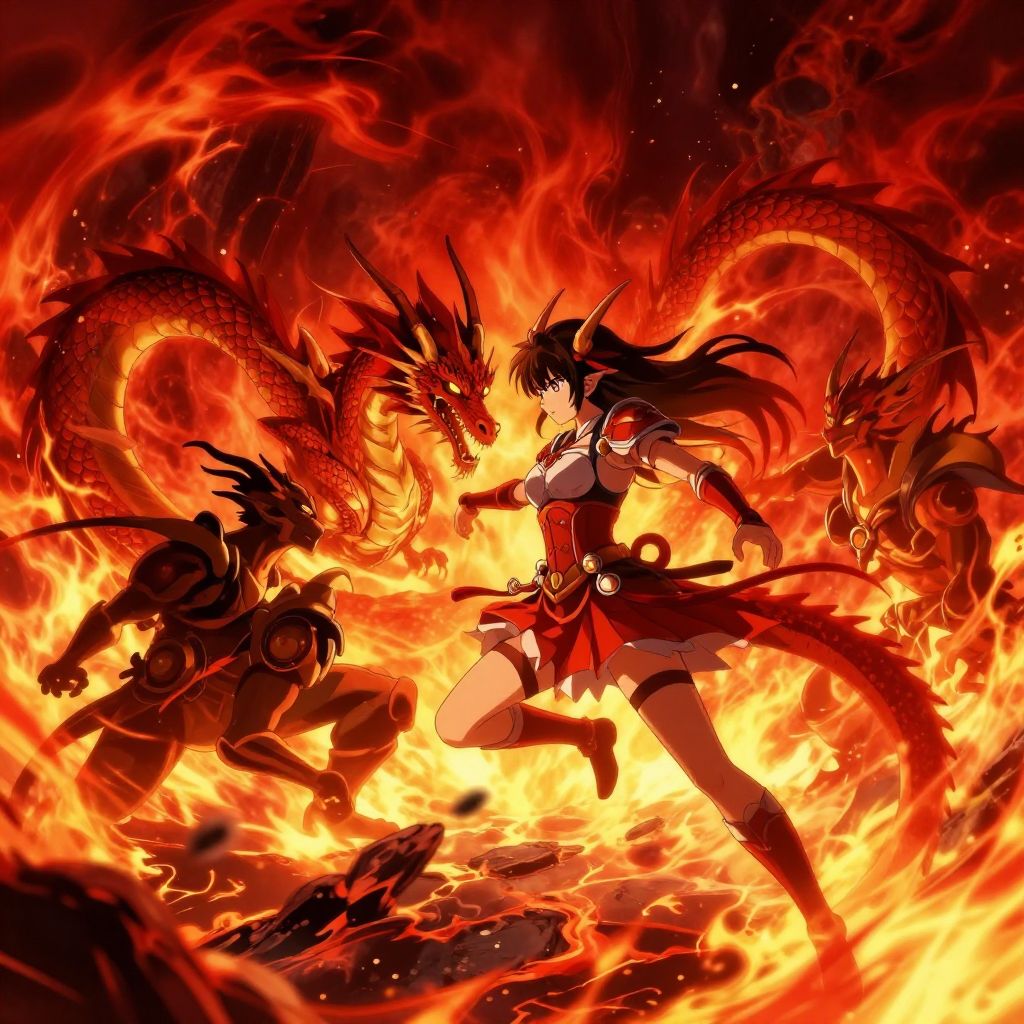 Anime with dragon girl battling mythical creatures in a fiery volcanic arena, intense action scene, dynamic movement, intricate design of dragon scales and armor, flames and smoke effects, vivid reds and oranges, dramatic shadows, high detail anime illustration.