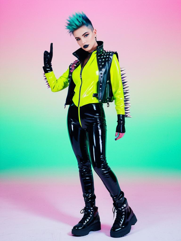 Portrait of a young athletic build woman with blue and purple mohawk hairstyle wearing a neon green and black leather and latex catsuit adorned with spikes. She accessorizes with a black reflective holographic vest, black gloves, and chunky black platform boots, posing against a pastel gradient sunset studio background in vaporwave style.