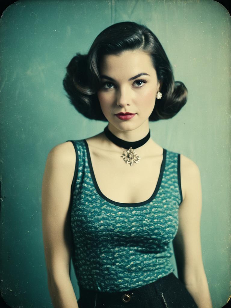 Portrait of a young woman with vintage-inspired hairstyle wearing a sleeveless scoop neck tank top with a subtle pattern, paired with high-waisted black shorts. She accessorizes with a thin black choker featuring a gold pendant and vintage-style earrings. The background is muted green, creating an elegant retro aesthetic.