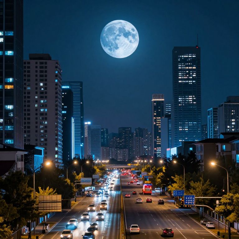 Photograph of a nighttime cityscape with a glowing full moon, illuminated skyscrapers, and busy streets with headlights and taillights.