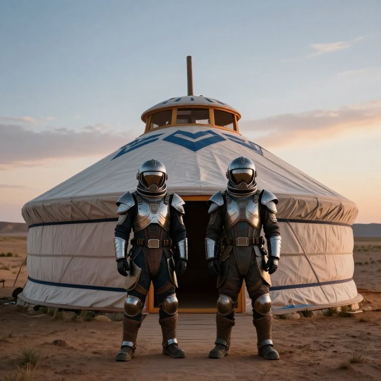 In this photorealistic and highly detailed image, two individuals dressed in futuristic space suits stand confidently in front of a traditional Mongolian Yurt, which is a striking structure with a dome-shaped roof adorned with geometric patterns and a central spire. The Yurt's exterior is a blend of metallic and earthy tones, creating a striking contrast with the desert landscape that surrounds it. The space suits, characterized by their metallic helmets and intricate armor, add a sense of otherworldliness to the scene. The composition is balanced, with the Yurt serving as a central focal point, and the space cowboys positioned symmetrically in front of it. The background features a vast, arid terrain with sparse vegetation, under a sky painted with hues of blue and orange, suggesting either dawn or dusk. The overall scene is captured with a high level of detail, likely using a Hasselblad camera with a macro lens, as indicated by the sharpness and clarity of the textures and colors.