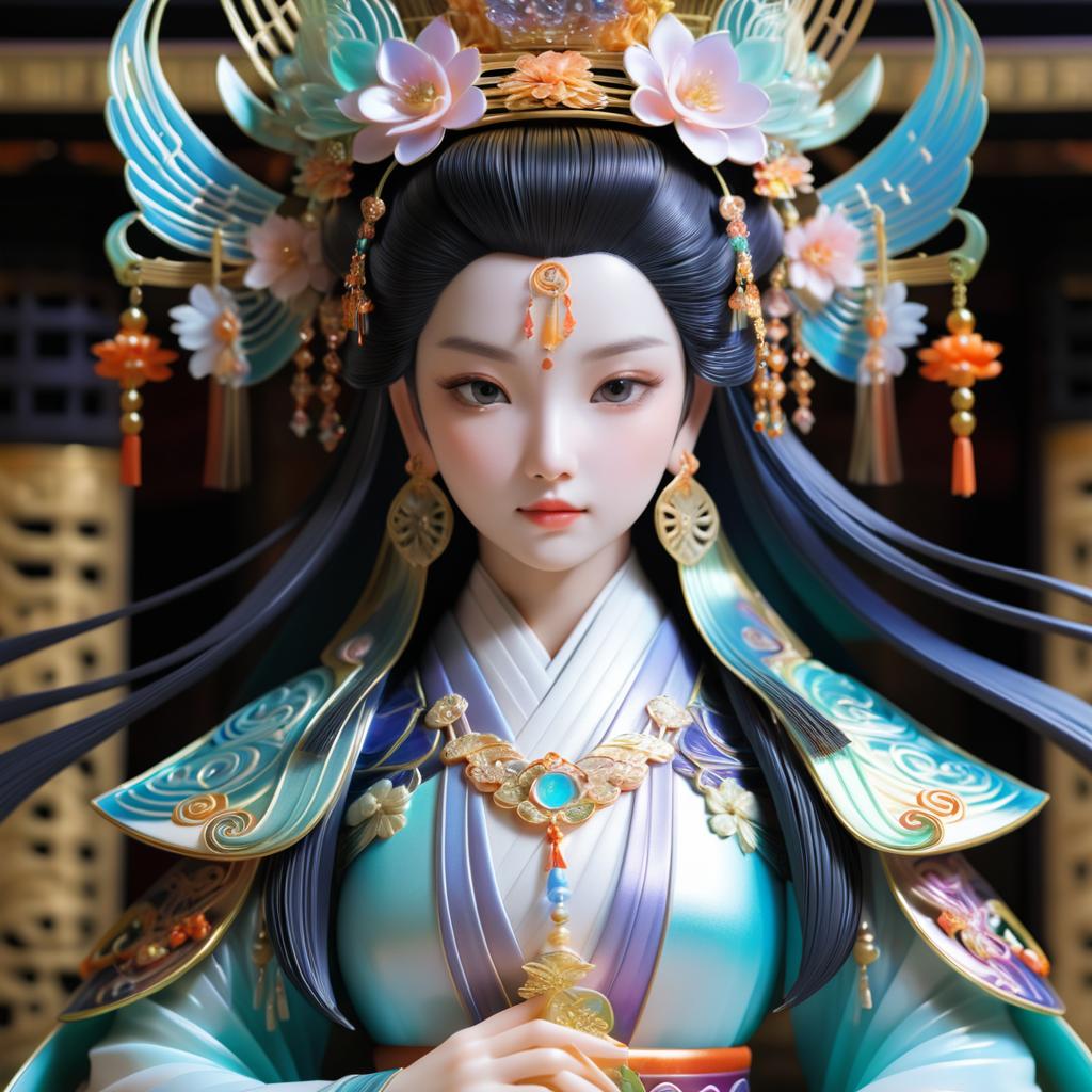 3D close-up of an elegant shinto priestess, with iridescent accents, by Sakimichan, intricate Japanese influences.