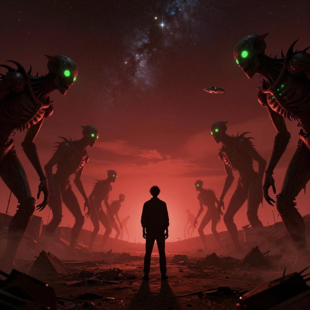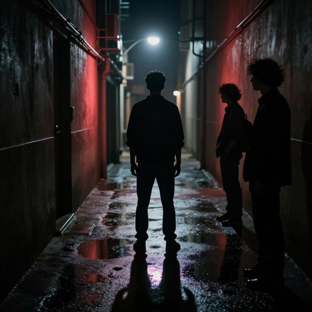 Three silhouetted men standing in a narrow, wet alley at night. The central figure faces away from the camera towards a glowing streetlight, while two others stand on the right side partially facing him. The alley is lined with dark concrete walls, with one side illuminated by red light. Water puddles cover the reflective ground.