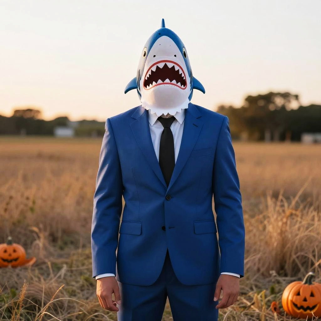 Blue Shark Halloween, man in a blue suit and shark mask standing in a field