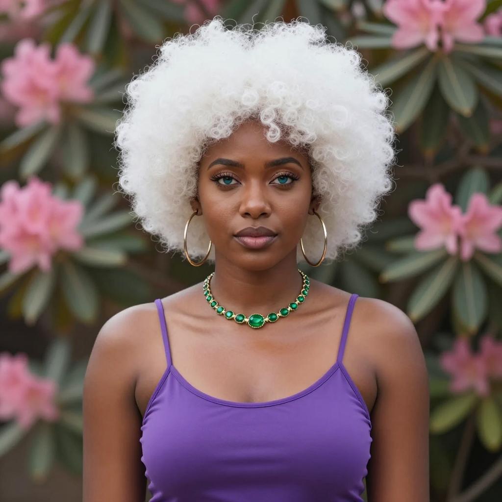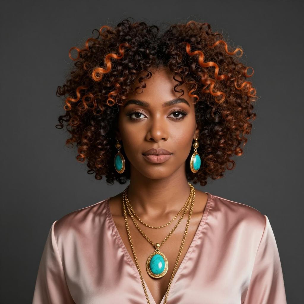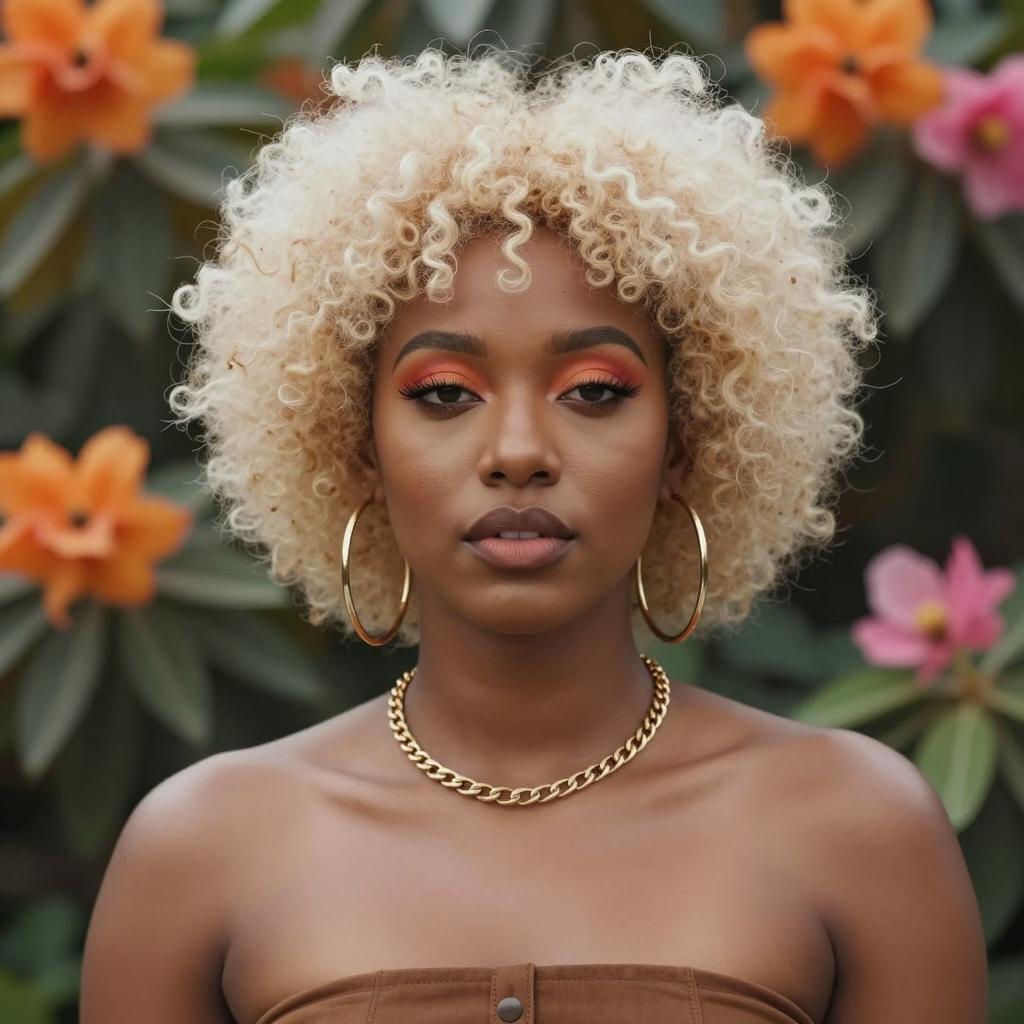 Orange disco costume, photorealistic, African-American woman, medium-dark skin tone, curly orange hair, wearing orange feathered dress, orange and black patterned bodice, black belt with large circular buckle, standing outdoors, daytime, blurry urban background, potted tree, man in white shirt in background, confident expression, stylish, vibrant colors, fashion photography, city setting
