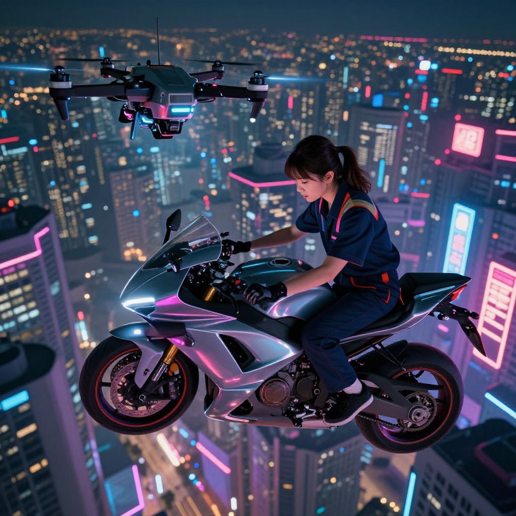 Cyberpunk night scene: Woman with dark ponytail and black outfit rides glowing white motorcycle above neon-lit city, drone hovering above. Digital art