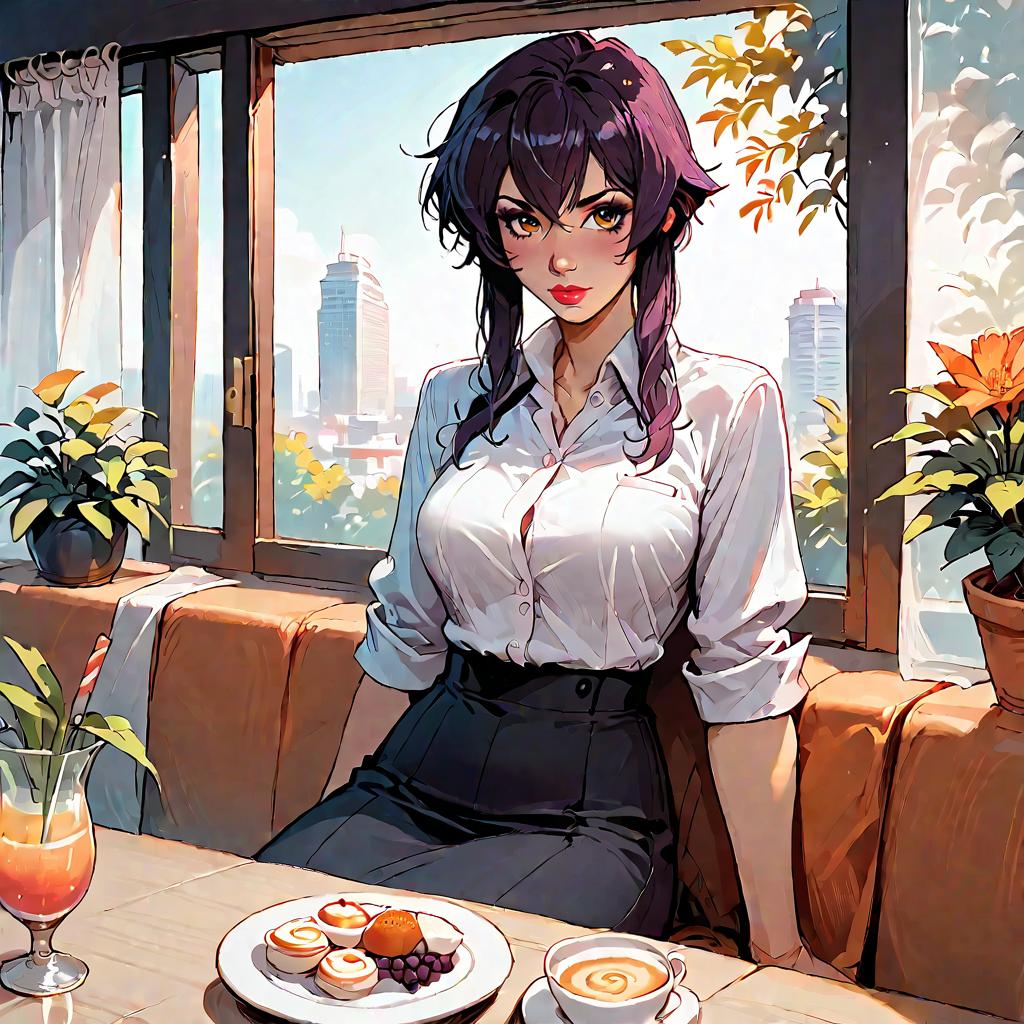 Score_9, source_anime, 1girl, gits1995, kusanagi motoko, business suit, cafe, sitting