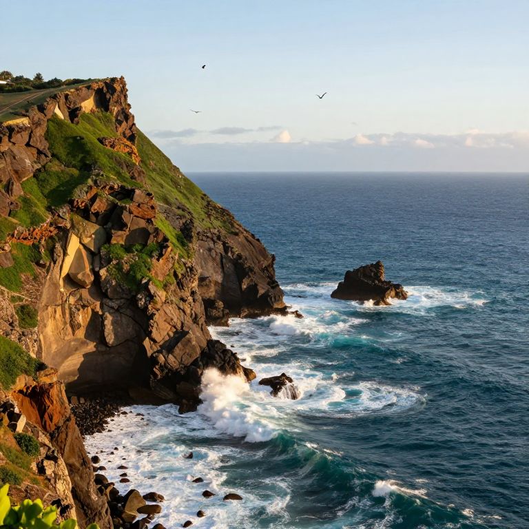 Madeira coastal cliffs with crashing turquoise waves, dramatic rock formations covered in green vegetation, seabirds soaring overhead, golden hour lighting casting long shadows, peaceful lighthouse in distance, textured rugged terrain, expansive ocean horizon