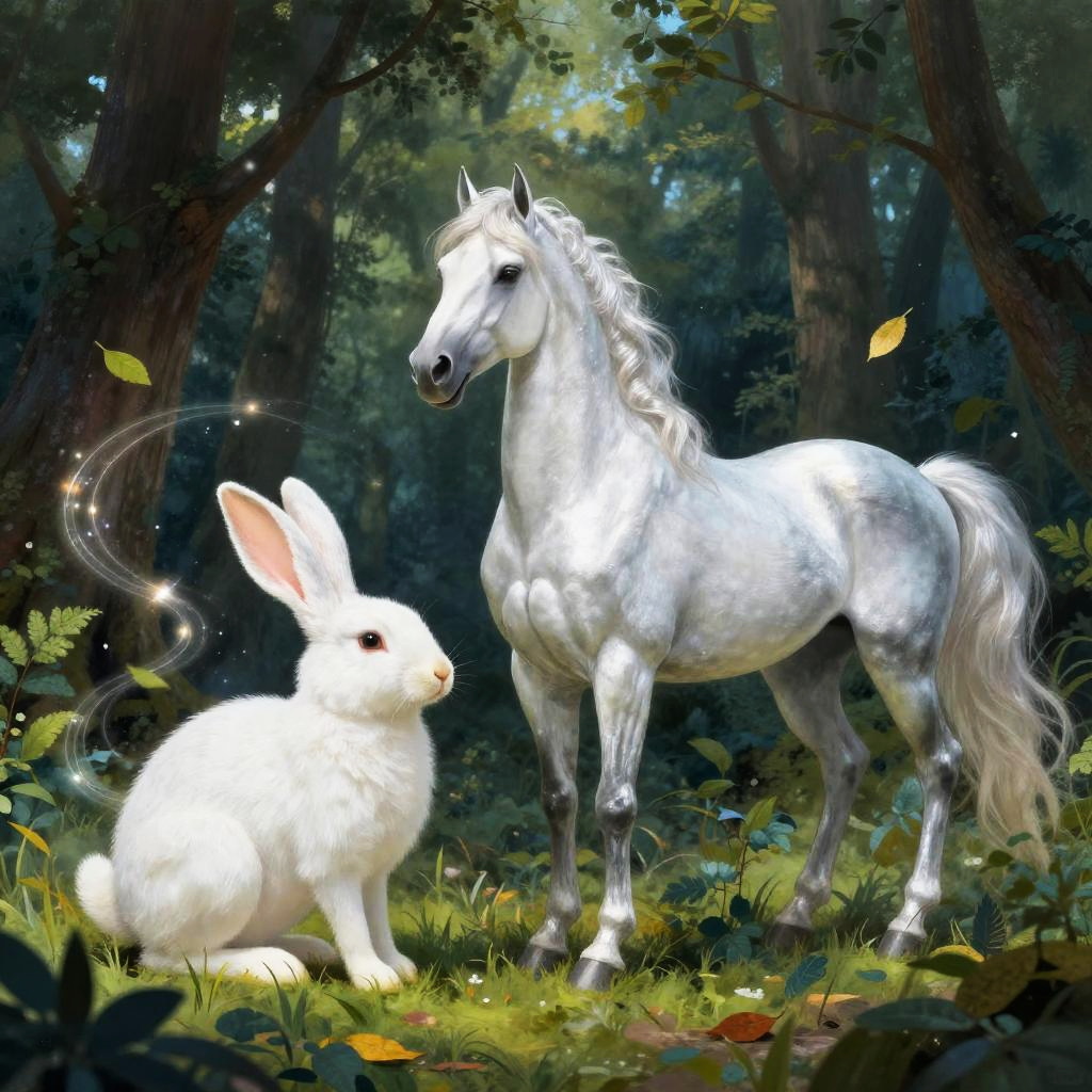 Failinis, symbol of luck and transformation, portrayed as a mystical creature transforming between a white hare and a silver horse in a vibrant enchanted forest, swirling leaves and light trails around, surreal fantasy artwork, vibrant and mystical ambiance