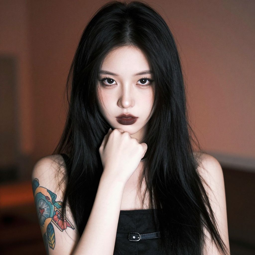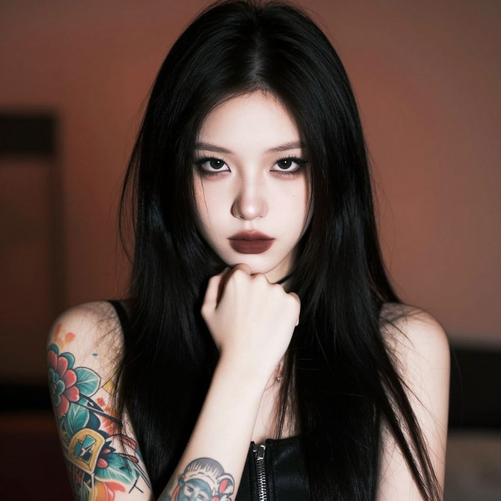 This is a digitally altered photograph of a young woman with pale skin, long black hair, and dark lipstick. She has colorful tattoos on her right arm and a black sleeveless top. Her left hand is raised to her chin, and she has a slightly intense expression. The background is blurred with warm, reddish-brown hues, creating a contrast with her dark clothing and hair.