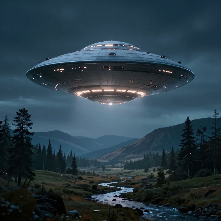 A large, hovering UFO hovers over a serene landscape with mountains, trees, and a stream, casting a mysterious glow.