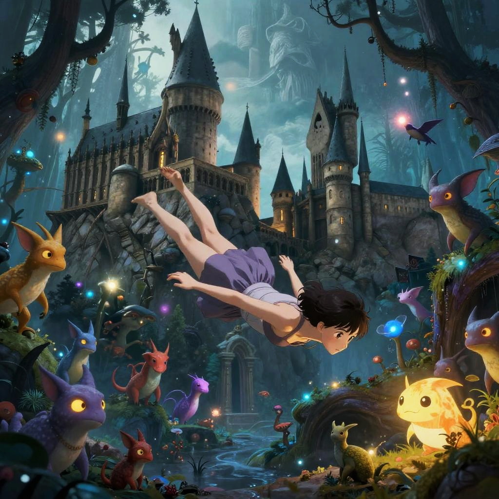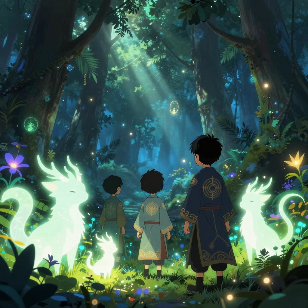 A swirling anime world portal opening in the middle of an enchanted forest, sparkling magical runes floating around, ethereal light beams piercing through dense foliage, whimsical creatures peeking from behind trees, vivid colors blending fantasy and sci-fi elements