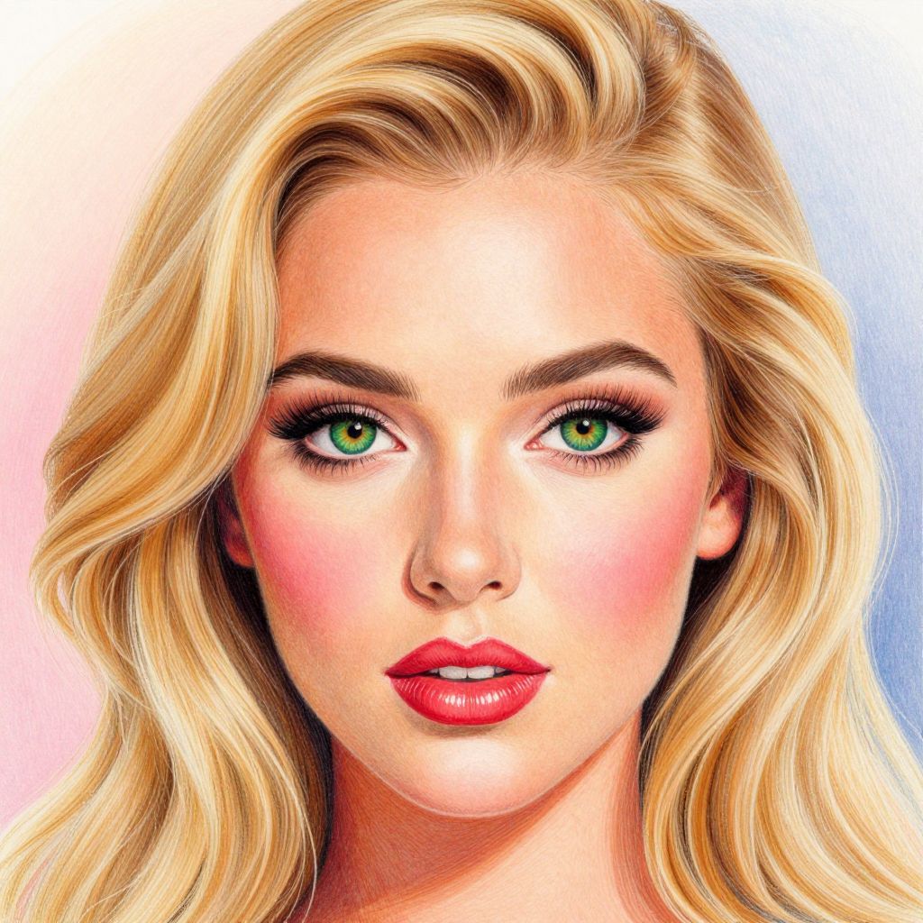 Vibrant colored pencil portrait captures a detailed close-up of a woman with golden hair styled in loose waves, featuring striking green eyes, bold eyelashes, rosy cheeks, and glossy red lips, set against a soft gradient background.