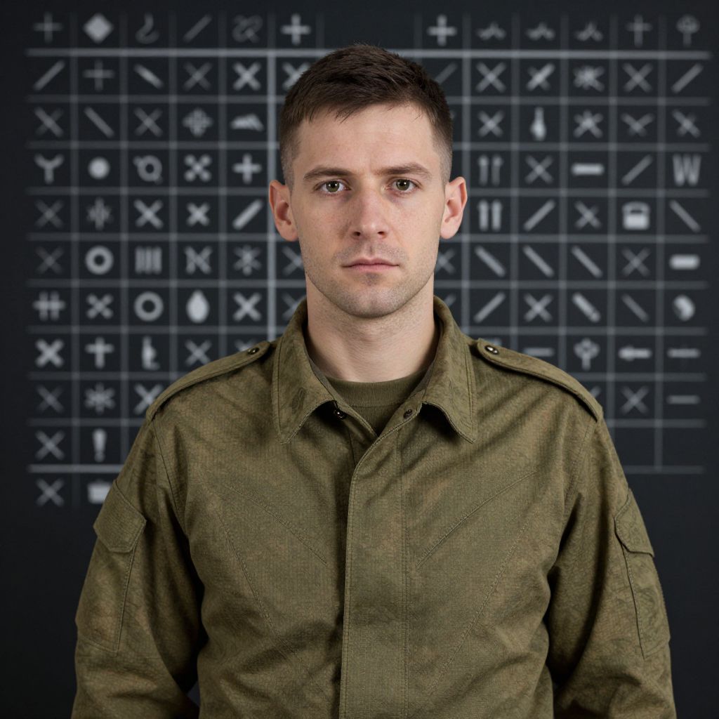 A man in a military uniform with a grid and symbols in the background, suggesting a theme related to cryptography or code-breaking.