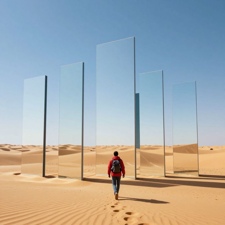 In a surreal 3D-rendered desert landscape, a lone traveler in a red jacket and backpack walks toward a series of towering mirror-like panels, each reflecting shimmering, alternate horizons that blend seamlessly into the vast, golden sands beneath a clear blue sky.