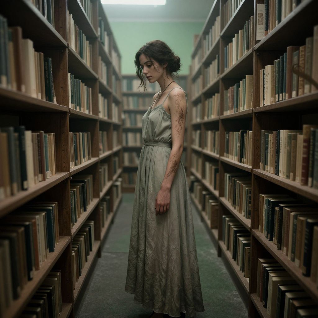 In a hushed library where shelves stretch endlessly into a misty green void, a woman in a flowing gown stands amidst rows of sentient books, her skin marked by faint ink trails as stories seem to whisper secrets onto her flesh.