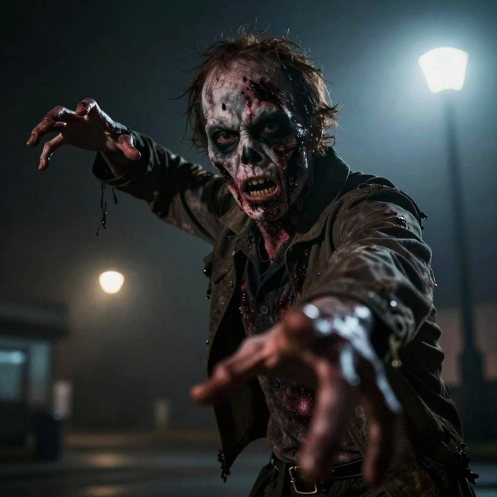 Close-up of a zombie pose with outstretched arms reaching forward, grotesque makeup and wounds, dimly lit with flickering street lamps, foggy night background, horror movie vibe