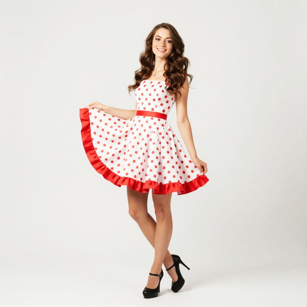 Photograph of a smiling young woman with long brown hair, wearing a white dress with red polka dots and a red ruffled hem. She's standing against a plain white background, holding out the skirt of her dress and wearing black high-heeled shoes. The image has a slight blur effect, giving it a playful, vintage vibe.