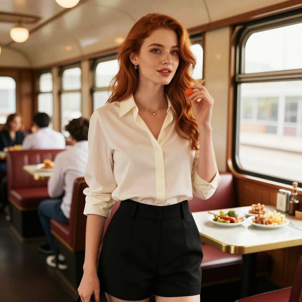 (photo of 30y.o. woman:1.4), (white skin:1.3), skinny, freckles, (perky breasts:1.2), posing inside bus, (smiling:0.9), ([open|sleepy] eyes:1), (best quality, 8K, realistic), (detailed eyes, detailed skin, highly detailed background:1.1), medium hair, Bob cut hair, (wavy hair:1.1), (oily hair:0.8), (__colors__ hair:1.2), (Military style:1.3), (wearing blouse and shorts:1.2)