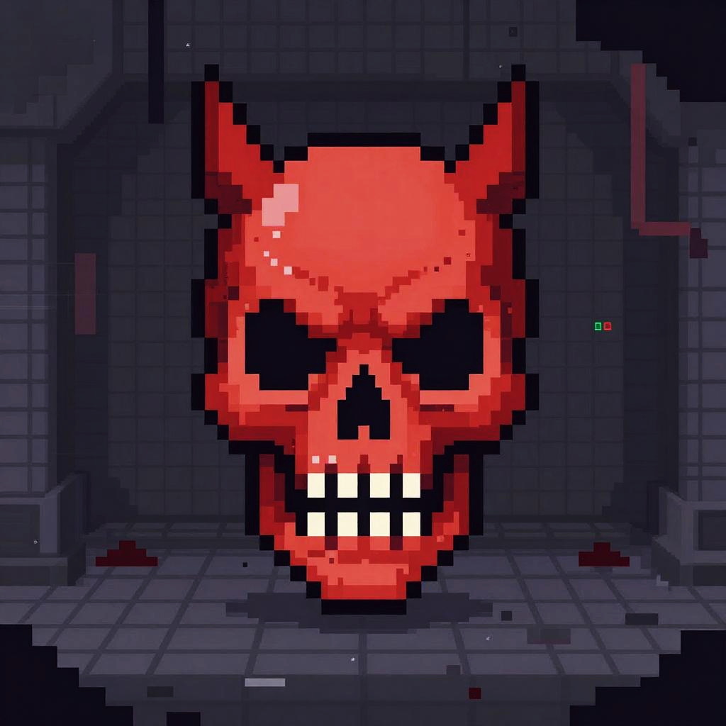Pixel art of a large white skull with black eye sockets and teeth, centered in a dark, tiled room with red blood splatters and glowing red and