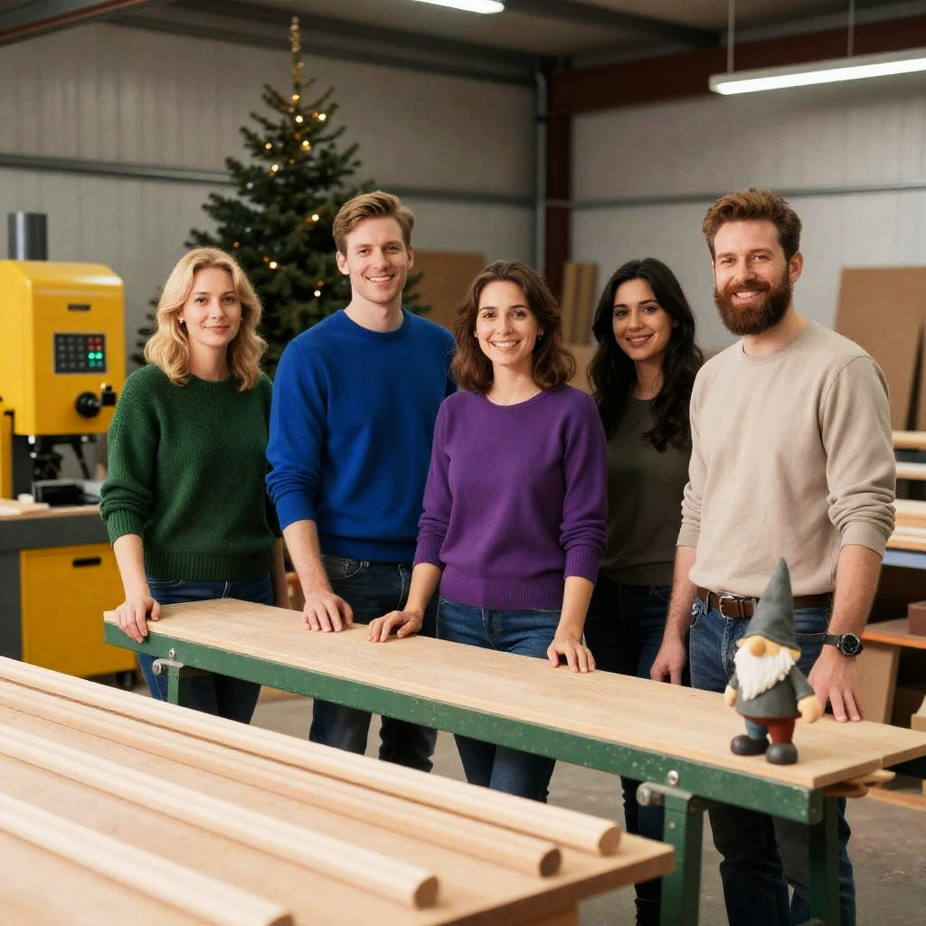 Photograph of five people in a woodworking shop. Four stand together, one man leans on a green workbench. Blonde woman in green sweater, man in blue sweater, woman in purple sweater, dark-haired woman, bearded man in beige shirt. Christmas tree in background, yellow woodworking machine, wooden dowels in foreground, garden gnome on bench. All smiling. Industrial setting with metal ceiling and visible pipes.