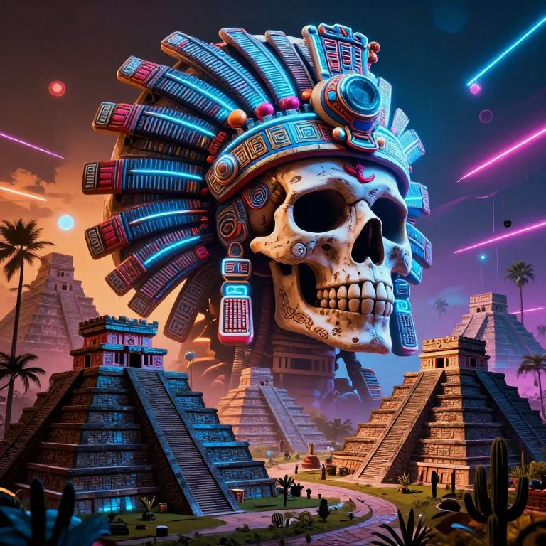 The image presents a surreal, futuristic depiction of an Aztec civilization, blending ancient and futuristic elements. Dominating the scene is a large, intricately detailed skull adorned with a vibrant, neon-blue headdress, positioned centrally. Surrounding the skull are various Aztec-style pyramids and temples, each illuminated with neon lights, creating a striking contrast against the dark, shadowy background. The pyramids are scattered throughout the scene, some closer to the foreground and others further in the distance, creating a sense of depth. The sky is a mix of warm and cool tones, with neon streaks and glowing orbs adding to the otherworldly atmosphere. Palm trees and cacti are interspersed among the structures, their silhouettes adding to the depth and complexity of the scene. The overall composition is dynamic, with elements interacting in a harmonious yet chaotic manner, reflecting the blend of past and future.