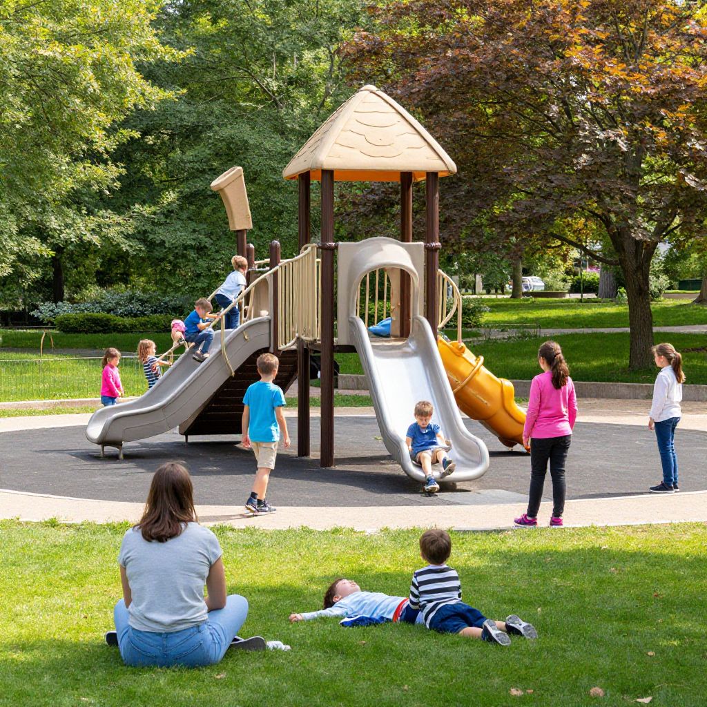 The image depicts a vibrant park setting with a playground as its focal point. The playground features a large slide with a curved structure, positioned centrally and surrounded by various play equipment. A group of young people, including children and adults, are engaged in different activities. One child is sliding down the slide, while another is climbing up. A young boy in a blue shirt is walking towards the playground, and a girl in a pink shirt is standing nearby, observing the scene. In the foreground, a woman in a gray shirt and blue jeans is sitting on the grass, accompanied by a young boy in a striped shirt and shorts, who is lying on the ground. The park is lush with greenery, including trees with autumn-colored leaves and well-maintained grass. The overall atmosphere is lively and inviting, with people enjoying a sunny day outdoors.