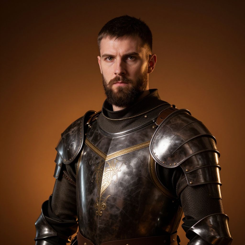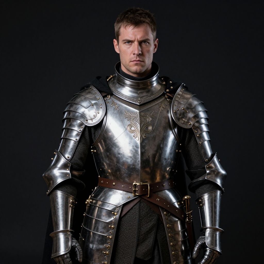 Photograph of a serious-looking, medium-built man with short brown hair standing against a dark background. He's wearing shiny, medieval-style silver armor with intricate designs, a black cloak, and a brown belt. His armor is detailed with gold accents and his face is slightly shadowed. The image has a dramatic, high-contrast lighting effect, highlighting the metallic texture of his armor.