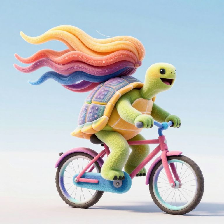 An ancient tortoise rides a bicycle made entirely of rainbow foam, weaving through a sky that never sees clouds due to the constant laughter of the wind.