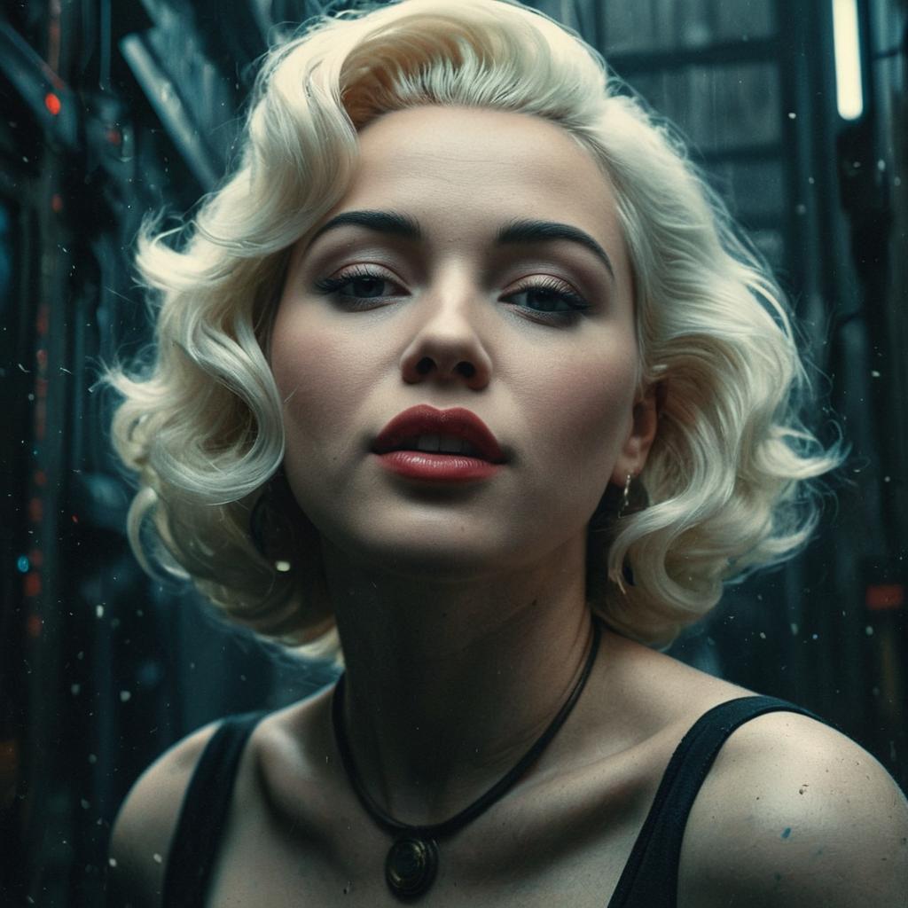 A hyper-realistic close-up portrait of a woman with platinum blonde, wavy hair styled in a vintage fashion. She has fair skin, bold red lipstick, and subtle eye makeup. The woman wears a black spaghetti strap top and a pendant necklace. The background is dark and blurred, suggesting a moody or sci-fi atmosphere.