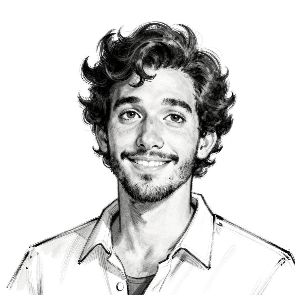 This is a black-and-white digital drawing of a smiling man with curly hair and a slight beard. He has expressive eyes and a gentle smile, looking slightly upward. He's wearing a collared shirt, and the sketch has a loose, hand-drawn style with visible line work and shading. The background is plain white, making the character stand out.